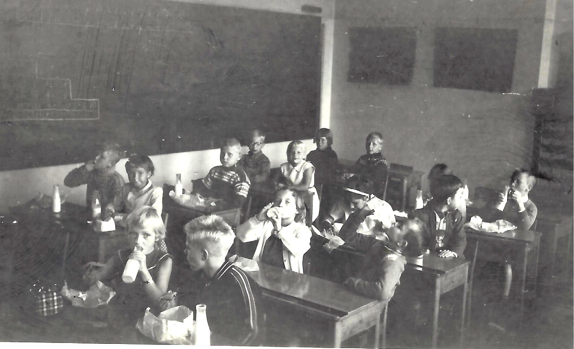 Hr Sønderlund gik altid i grønne plusfours og sandaler. Vi fik gratis en kvart liter mælk til frokost. Den blev hentet af særligt udvalgte mælkedukse i kælderen. Først var det i glasflasker, senere i pap. Der var enkelte i klasserne, der også fik madpakker. Da vi gik i skole, var det tilladt lærerne af slå. Revselsesretten blev først afskaffet i folkeskolen i 1967. Det er nu meget få episoder Randi kan huske, hvor der er blevet slået. Randi havde på et tidspunkt en vikar i religion, som yndede af banke sit nøglebundt hårdt ned i hovedet på klassekammerater, hvis de gjorde noget forkert. Kirsten derimod havde en lærer-Dich Nielsen, som virkelig slog igennem, så drengene faldt, når de fik en lussing. |